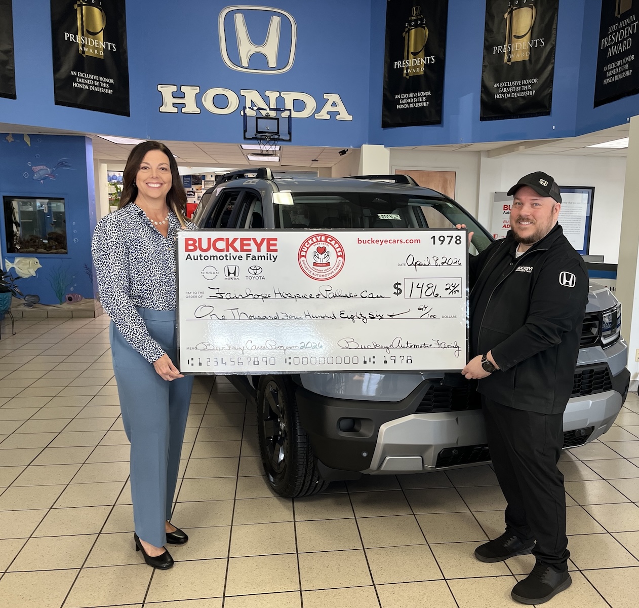 Bryce Rehrer, Service Manager at Buckeye Honda, presents Kristin Glasure, President and CEO at FAIRHOPE Hospice and Palliative Care, with the Buckeye Cares 2026 March Donation!